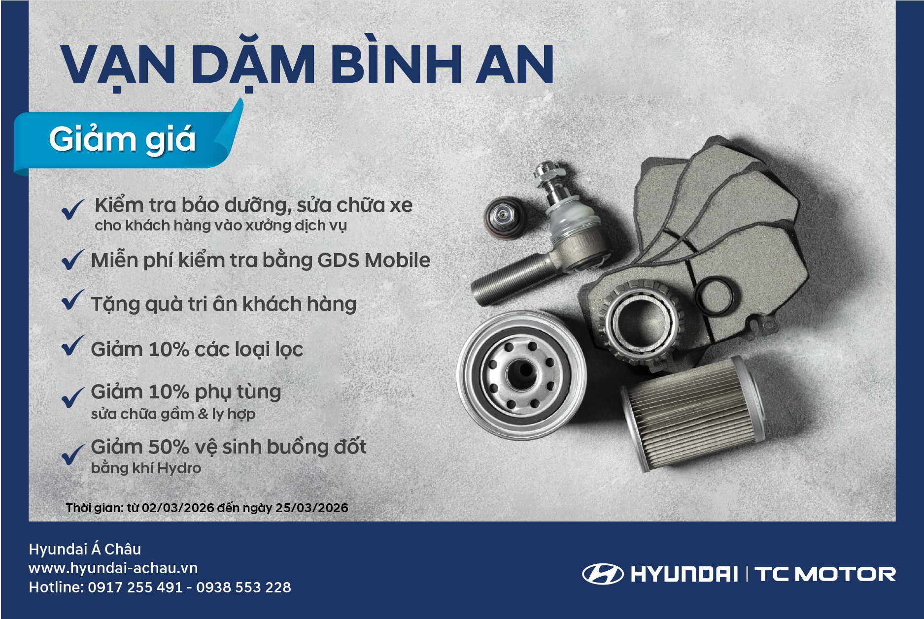 Nhằm tri ân Quý khách hàng đã luôn tin tưởng và đồng hành, Hyundai Á Châu triển khai chương trình ưu đãi dịch vụ đặc biệt với chủ đề “Vạn Dặm Bình An” – Chăm sóc xe toàn diện, an tâm trên mọi hành trình!